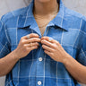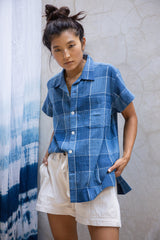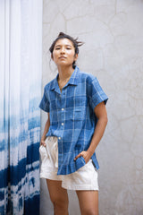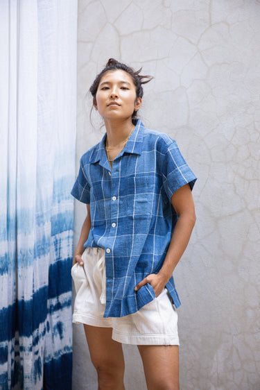 We took all of the best details from mid century USN chambray shirts. Wide french placket, one piece camp collar, double chest pockets, and oversized fit. We developed this beautiful handwoven box check with our non-profit partners in Gujarat, India. Woven from wild-growing kala cotton yarns dyed to different levels of blue with plant based indigo, this fabric is naturally organic, with the most amazing light weight and drape. White mother of pearl fisheye buttons. Cold water machine wash with like colors and hang dry. Measurements: