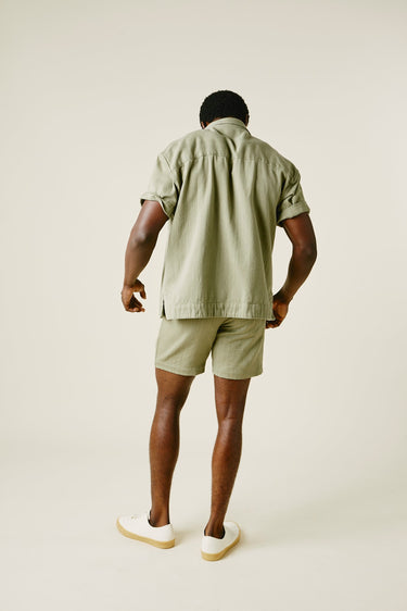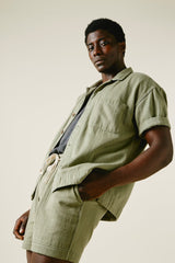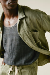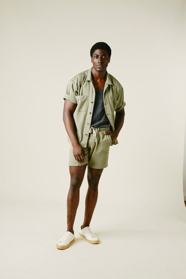 We took all of the best details from mid century USN chambray shirts. Wide french placket, one piece camp collar, double chest pockets, and oversized fit. Issued here in our od green military herringbone. Yarns dyed with a mix of henna, turmeric, and iron water. Burnt olivewood flying saucer buttons. Cold water machine wash with like colors and hang dry. This season we've made some adjustments to fit, making it true to size. Yabi is 6' and wears a sz 3