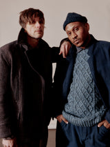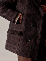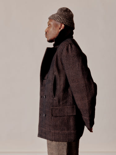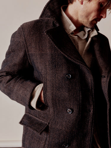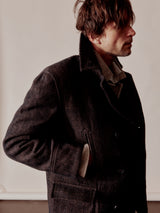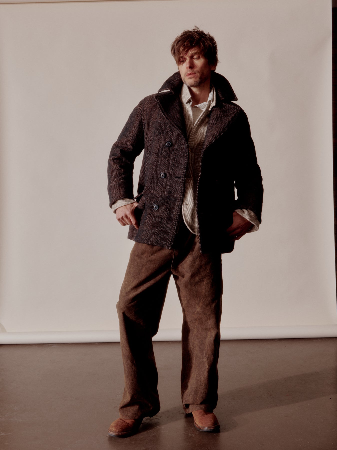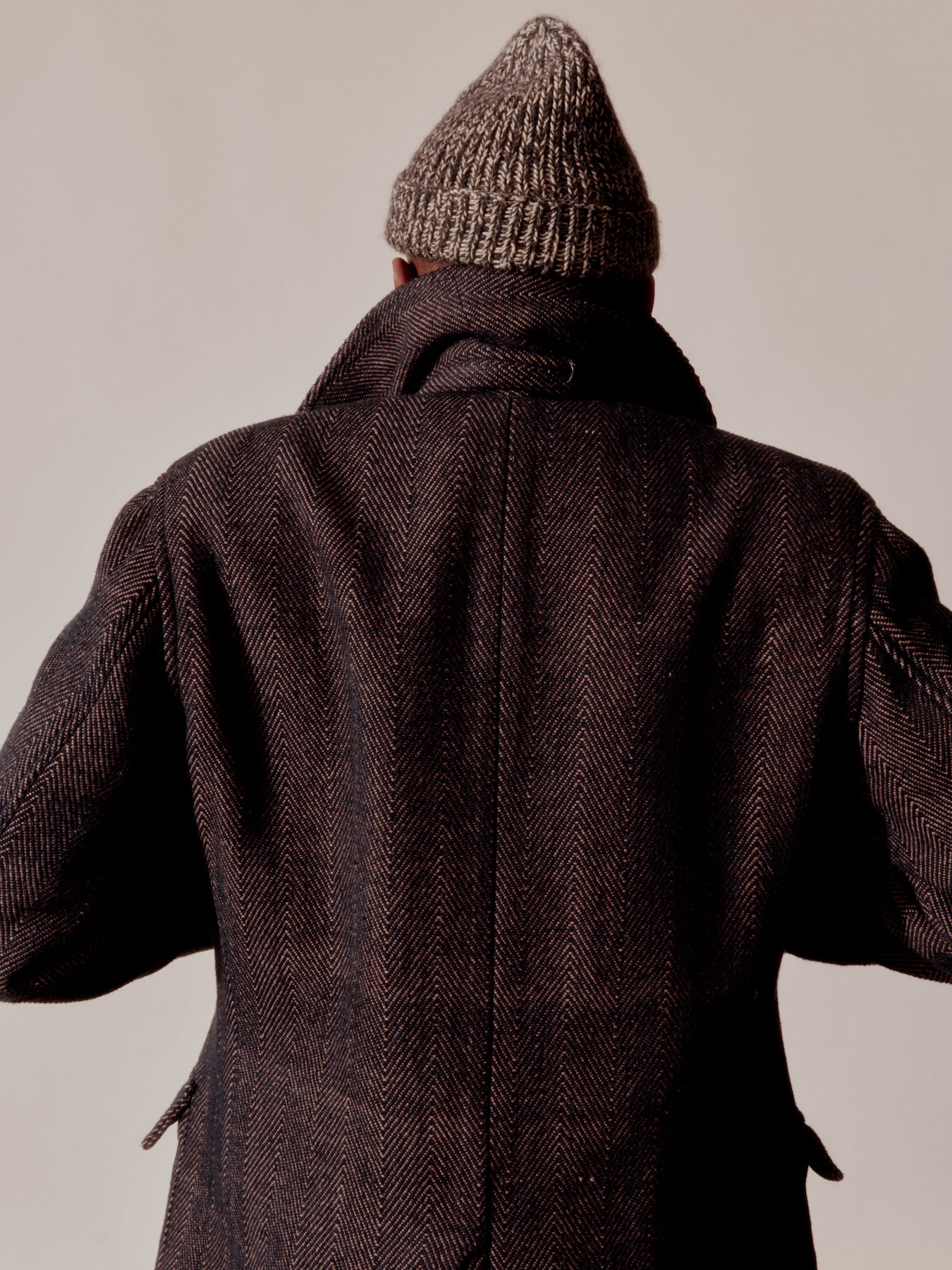 The loft peacoat references vintage USN Peacoats from the 40's. Reimagined with a straighter, roomier fit with full collar and lapel. Double Breasted construction with Patch Pockets at hem and vertical welt pockets at body. Lined with our handwoven denim and finished with horn buttons at placket