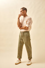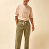 Cold water machine wash and hang dry. This fabric feels a little stiff out the gate and softens considerably after the first wash. Wes is 6'1" and wears the sz 3.