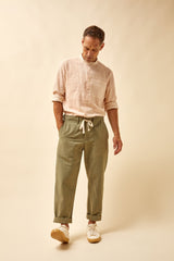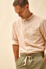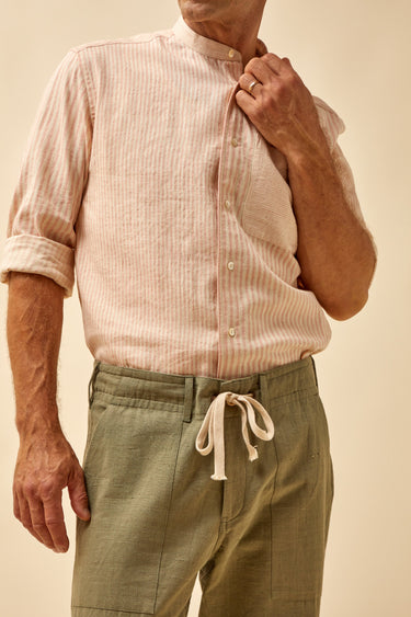 Our LS Band Shirt is back, this time in a fun mix of block printed bengal stripes. Our handwoven kala cotton, block printed with plant based Indian Madder Root paste, and patched together in a beautiful and subtle mix of stripes.