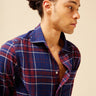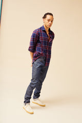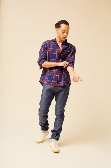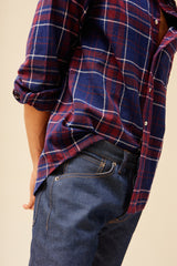 Our Matty Shirt in handwoven madras. The yarns are a beautiful cross of plant based indigo and indian madder root. A beautifully textured medium weight spring and summer staple.