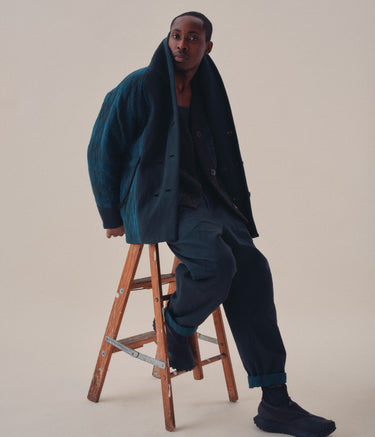 This thing is nuts. Inspired by WW2 Parkas, we made this reversible to feature the plaid lining at the sleeves. Our signature handspun, handwoven denim on the outside and our handwoven big plaid on the. interior. Diamond quilting and Trapunto stitching all quilted manually. 100% cotton batting and chunky Cotton khadi lining. Horn buttons and both sides. Cut for a unisex fit. Only one size, only 2 available because it takes so long to make. This thing is majestic.