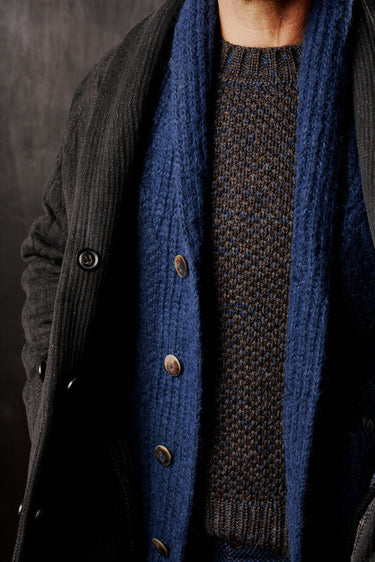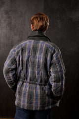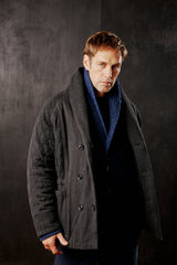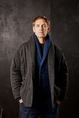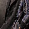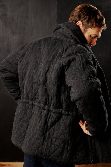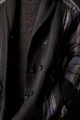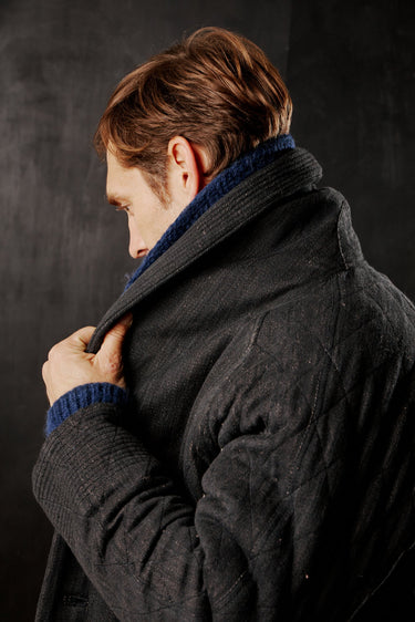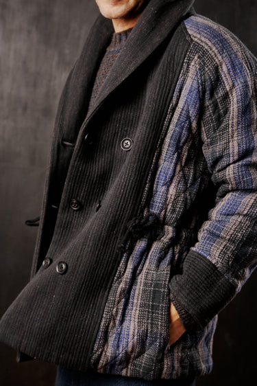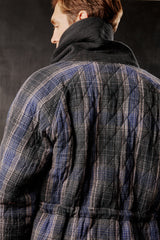 This seasons reversible Shawl Overcoat is cut from our iron black warp/indigo weft denim on one side and our new indigo/iron shadow plaid on the other. A big update this season sees this become a true double-breasted piece. Manually stitched diamond quilting all throughout the body. Trapunto stitching at the Collar, placket, and cuffs. Filled with 100%cotton batting and finished with horn buttons. Pockets on both sides of the coat and a drawcord at the waist.